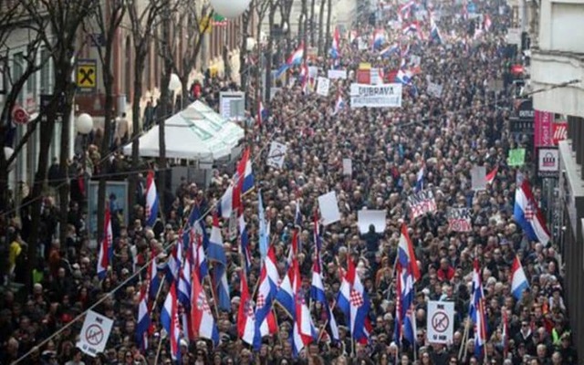 “Andreja lažeš” Na mjesto okupljanja prosvjednika (Trg žrtava fažizma), u blizini središnjice HDZ-a, stigao sam oko 10.45 sati. Bilo je prekrasno sunčano jutro. Odmah sam sebi u bradu rekao: “Evo, i dragi Bog je s hrvatskim narodom, makar su ga se mnogi Hrvati svojim sotonskim ponašanjem odrekli. Na mjestu okupljanja već je bilo desetak tisuća prosvjednika, koji su došli iz svih krajeva Hrvatske i Bosne i Hercegovine te iz iseljeništva - od europskih zemalja do Kanade, SAD-a i Australije te Južne Amerike. Prostor oko Meštrovićeva paviljona, popularno zvanog “džamija”, bio je gusto popunjen, a naročit je dojam pružala scena sa stotinama hrvatskih barjaka i transparenata s različitim i potentnim porukama Plenkoviću (“Andreja lažeš”) i njegovoj antihrvatskoj Vladi, u kojoj sjede ministri koji su se prije ulaska u Vladu zaklinjali u svoje, kako sada vidimo, lažno domoljublje. Nije potrebno spominjati njihova imena, oni će se sami prepoznati, a i mi znamo o kojim je ministrima riječ. Jake snage policije čuvale su središnjicu HDZ-a. No, nikome od prosvjednika nije padalo napamet da uputi pogled prema sjedištu vodstva stranke koja postaje sve omraženija u hrvatskom narodu.