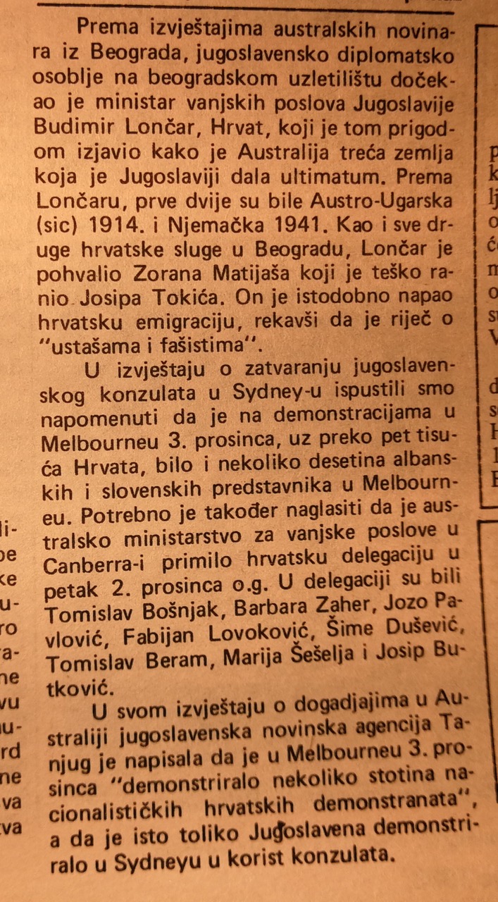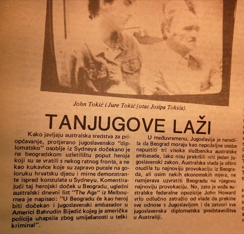 Fotografiju ranjenog Josipa Tokića i izvješće o dočeku srpskih terorista u Beogradu, te slika s prosvjeda Hrvata u Melbourneu, prenosim iz mjesečnika Hrvatska sloboda (Australija) iz prosinca 1988. godine.