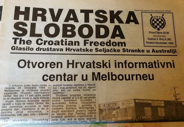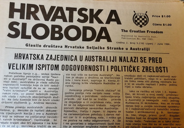 «U prošlom smo broju Hrvatske slobode donijeli kratku vijest da se priprema nova hajka na nas Hrvate u Australiji. Izvor za tu vijest bio je članak u vrlo uglednom australskom dnevniku iz Melbournea The Age od 3. travnja o. g. U članku pod naslovom Da li mi skrivamo nacističke kriminalce najavljena je serija od pet programa na državnoj radiopostaji ABC u kojoj će biti izneseni podatci o navodnim „nacističkim kriminalcima“ u Australiji, od kojih neki i danas imaju vodeće uloge u emigrantskim političkim organizacijama. Iako u članku nismo mi Hrvati bili spomenuti niti jednom riječju, dalo se naslutiti da se radi o, u Jugoslaviji planiranom, napadu na vrlo aktivnu hrvatsku državotvornu zajednicu u Australiji. Naime, u članku je iznesen podatak da su priređivači programa imali na raspolaganju jugoslavenske arhive o „ratnim kriminalcima“.