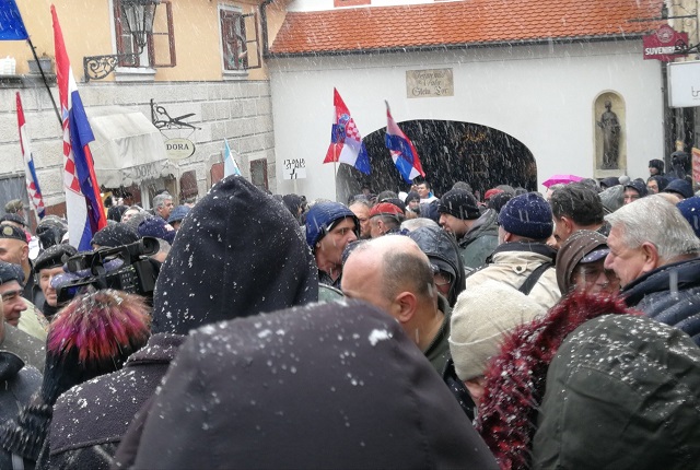 Nakon završetka prosvjeda na Trgu bana Josipa Jelačića prosvjednici su krenuli uz Radićevu ulicu prema Kamenitim vratima i Markovu trgu. Na Kamenitim vratima prosvjednici su se pomolili i krenuli prema Markovu trgu, gdje ih je odmah iznad Kamenitih vrata dočekala željezna ograda, iza koje je bio veći broj članova Specijalne policije, koji su ozbiljnih lica spriječili prolazak prosvjednika prema sjedištu Vlade Republike Hrvatske i Hrvatskom saboru, kojih danas ne bi bilo da muževi udovica branitelja Domovinskog rata nisu dali svoje živote kako bi obranili Hrvatsku od četničke agresije.