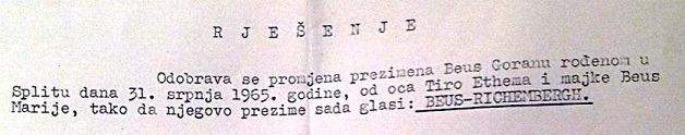 Majka ovog osebujnog tipa, znalci su ju od milja zvali 'radodajkom', Marija Beus rođena je i živjela u zaseoku Beusi, selo Zavojane, općina Vrgorac. Njen nestašni sinčić svojem je, po majci, prezimenu Beus samovoljno nadodao još i otmjeno, zvučno, plemićko prezime Richembergh i time se lažno proglasio 'Švabom'. Rješenje o toj promjeni/dopuni prezimena datira od 26.studenog 1985.godine upravo kad je taj lažni Nijemac navršio 20 godina starosti!