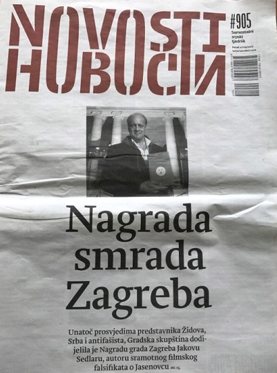 Improvizacija: „Unatoč prosvjedima…nas Srba i naše braće-Židova, Gradska skupština i našeg grada Zagreba demokratskom većinom dodijelila je Nagradu grada Jakovu Sedlaru pa stoga mi, ćirilične Pupovčeve 'Novosti' obilato dotirane od Obuljenkinog ministarstva kulture RH, ovim putem javno proglašavamo Grad Zagreb-SMRADOM!“