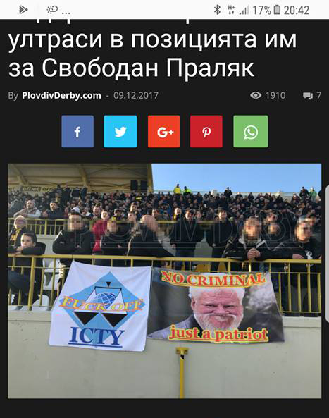 Tako nam je bugarska novinarka i publicistica Diana Glasnova nedavno predočila fotografije objavljene na internetskoj stranici navijača bugarskog nogometkog kluba „Botev“ iz Plovdiva koji se zovu „ultrasi“. Način na koji su ti ljudi reagirali na skandaloznu presudu nedužnom čovjeku doista je dirljiva i možemo biti ponosni na takve prijatelje. Oni nisu Hrvati. Čak nam nisu ni susjedi. Mogli su komotno okrenuti glavu po načelu: „Nije to naš problem“. Pa ipak, oni su osjetili potrebu za djelovanjem. Uložili su velik trud i novac kako bi dizajnirali i javno na stadionu pokazali što misle i o Praljku i o sramotnom društvu iz Haaga.