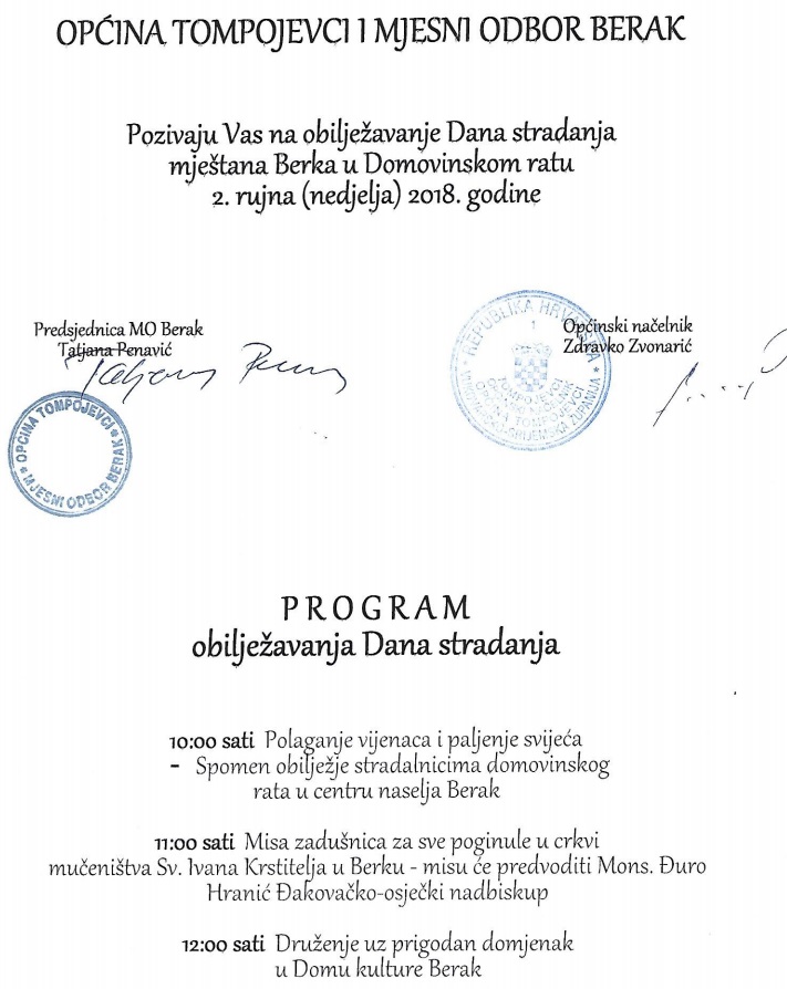 pozivaju vas na obilježavanja Dana stradanja mještana Berka u Domovinskom ratu