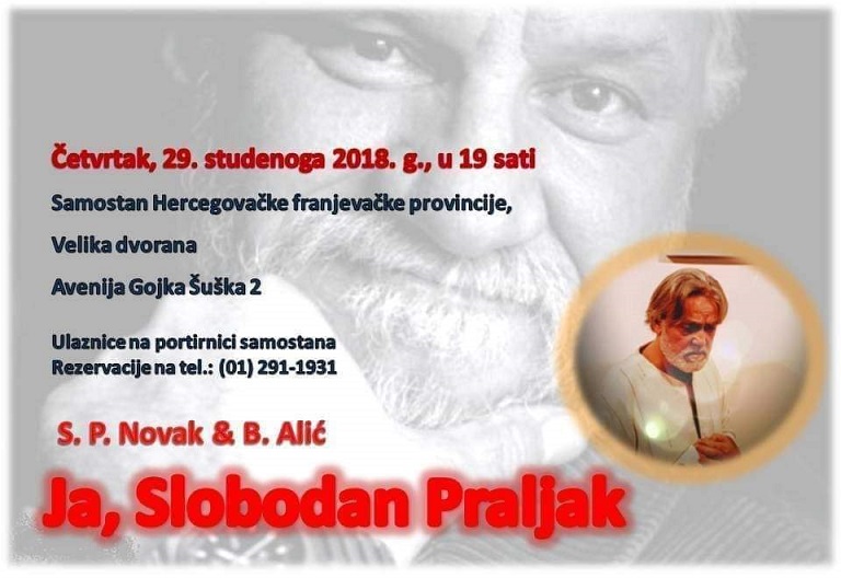 Praizvedba monodrame Božidara Alića - 'Ja, Slobodan Praljak' Detalji Objavljeno: Ponedjeljak, 19 Studeni 2018 08:00 fShare Tweet S.P.Novak & Božidar Alić Četvrtak, 29 studenog 2018 u 19 sati View the discussion thread. blog comments powered by DISQUS back to top Prethodno Sljedeće