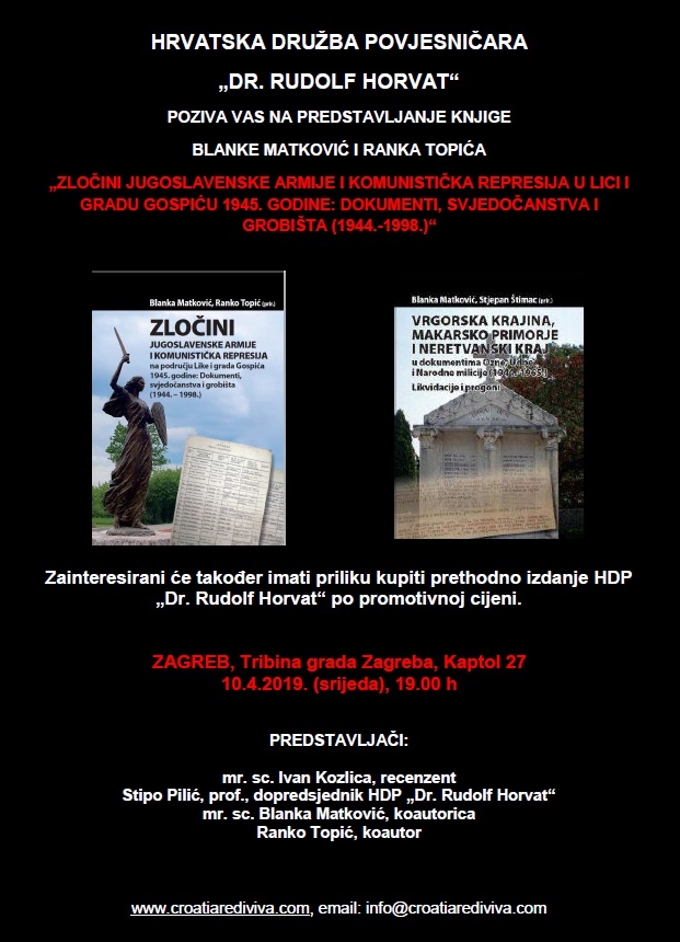 Krajem ožujka iz tiska izlazi novo izdanje Hrvatske družbe povjesničara „Dr. Rudolf Horvat“. Riječ je o zbirci arhivskih dokumenata pod naslovom “Zločini Jugoslavenske armije i komunistička represija u Lici i gradu Gospiću 1945. godine: Dokumenti, svjedočanstva i grobišta (1944.-1998.)” koja na oko tisuću stranica donosi mnoštvo dosad neobjavljenih dokumenata o stradanju hrvatskog stanovništva na području čitave Ličko-senjske županije te djelomično Gorskog Kotara u posljednjim tjednima i neposredno nakon završetka Drugoga svjetskog rata.