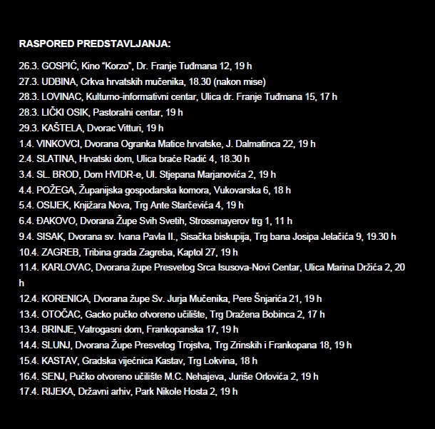 26.3. Gospić, Kino “Korzo”, Dr. Franje Tuđmana 12, 19 h (uz potporu Grada Gospića)