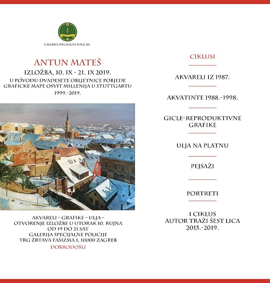 Pozivamo Vas na svečano otvorenje izložbe Antuna Mateša u utorak 10.09.2019. u 19 sati u Galeriji specijalne policije, Trg žrtava fašizma 1, Zagreb.