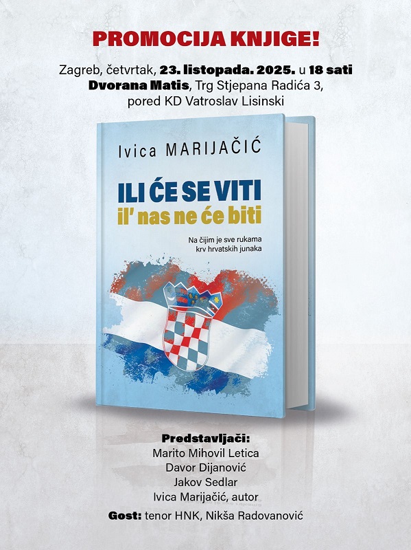 U četvrtak, 23. listopada 2025. godine u 18 sati, u dvorani Matis (Trg Stjepana Radića 3, Zagreb), u neposrednoj blizini Koncertne dvorane Vatroslava Lisinskog, održat će se svečana promocija knjige Ivice Marijačića pod naslovom „Ili će se viti il’ nas ne će biti – Na čijim je sve rukama krv hrvatskih junaka“.