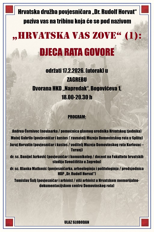 U povodu 35 godina od početak Domovinskog rata, Hrvatska družba povjesničara „Dr. Rudolf Horvat“ organizira seriju tribina pod nazivom „Hrvatska vas zove“.