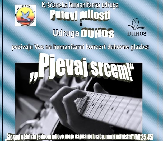 Kršćanska humanitarna udruga "Putevi milosti" i Udruga Duhos Vas pozivaju na humanitarni koncert duhovne glazbe koji će se održati u Vikarijatu u Osijeku 28.11.2018. s početkom u 20 sati. Molimo vas i da najavite i medijski popratite ovaj događaj.