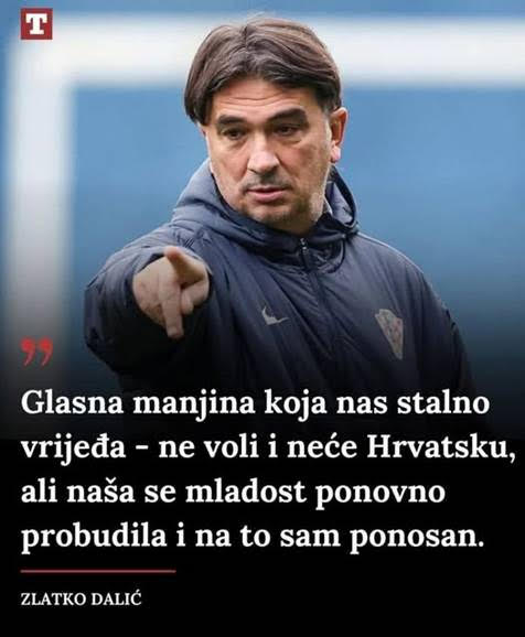 Može biti slika sljedećeg: Jedna osoba i tekst "T Glasna manjina koja nas stalno vrijeđa ne voli i neće Hrvatsku, ali naša se se mladost ponovno probudila i na to sam ponosan. ZLATKO DALIĆ"