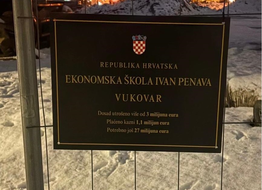 Riječ je o ploči koja je postavljena na gradilište nove Ekonomske škole Vukovar koja bi se trebala nalaziti kod naselja Olajnica. "Republika Hrvatska, Ekonomska škola Ivan Penava, Vukovar. Do sada utrošeno više od 3 milijuna eura. Plaćeno kazni 1,1 milijun eura. Potrebno još 27 milijuna eura", piše na ploči.